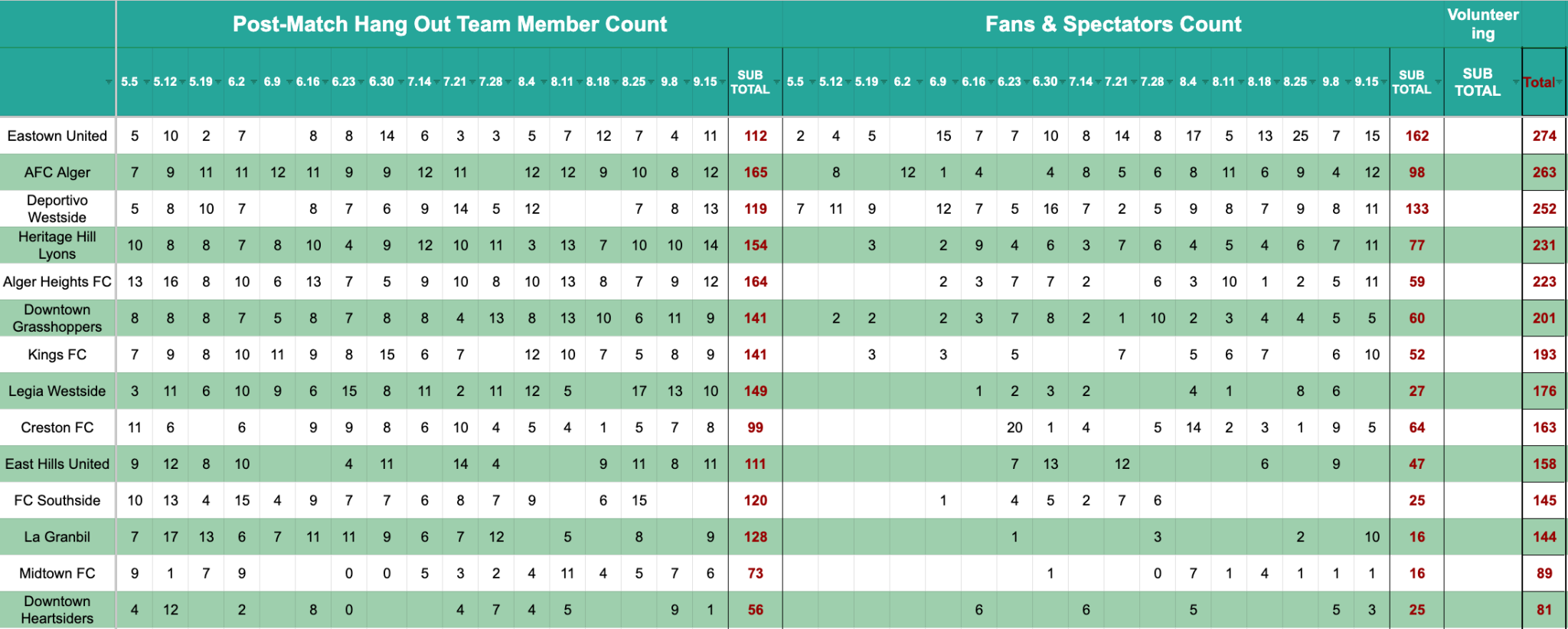 Champs League is a community league, so our standings table reflects that. Each week we count how many players from each team attends post-match hang outs – whether it’s the bar, going out for ice cream, or just hanging out at the field. Fan attendance is also counted! Stayed tuned for more points opportunities to come in the future.